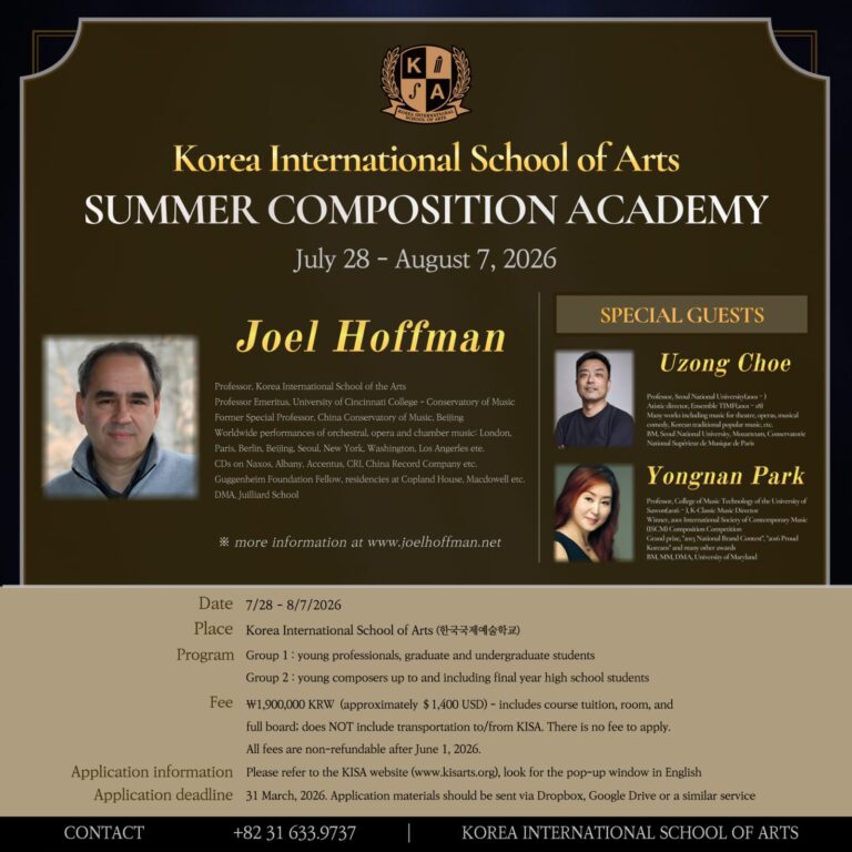 Summer’s composition course in South Korea at the Korea International School of Arts (KISA). The application deadline is 31 March, 2026 and the course dates are 28 July through 7 August. More information on the website...